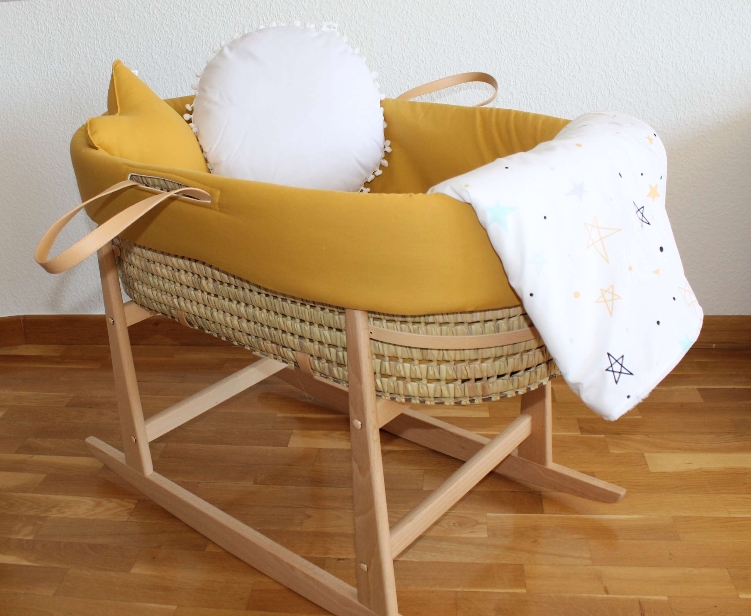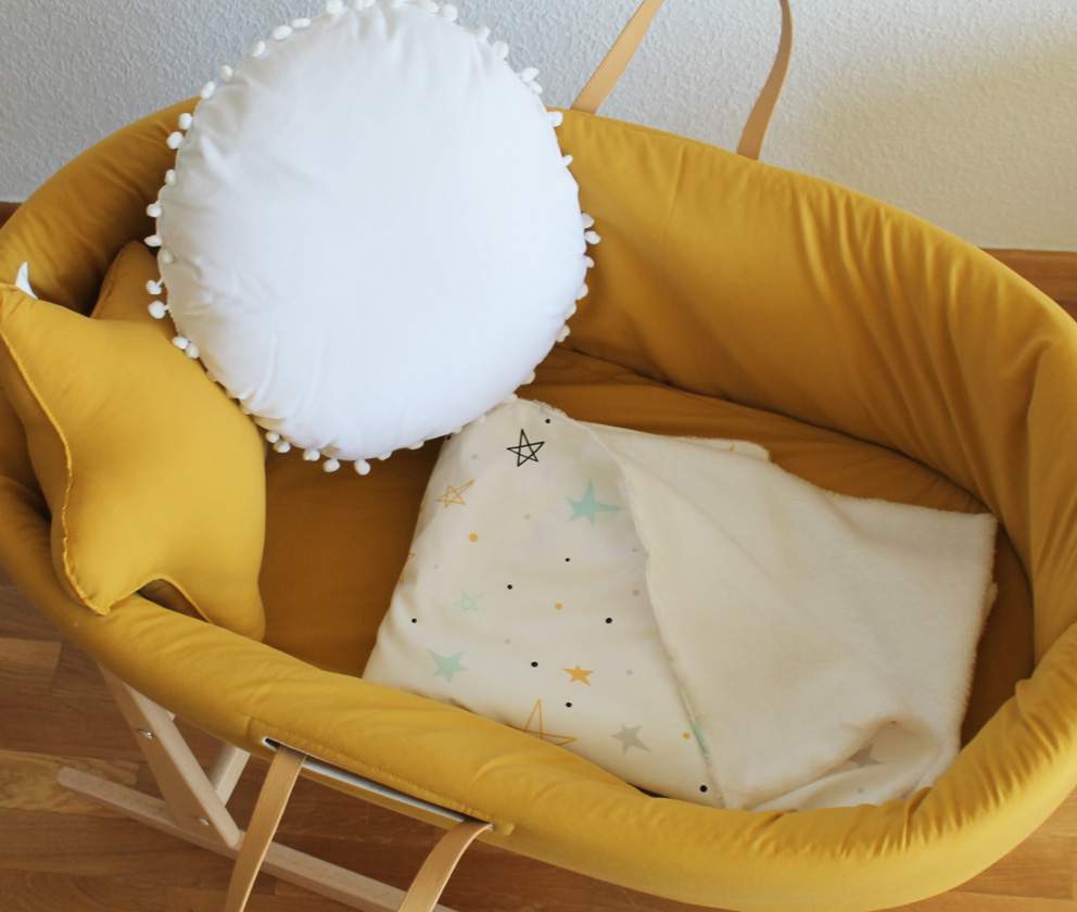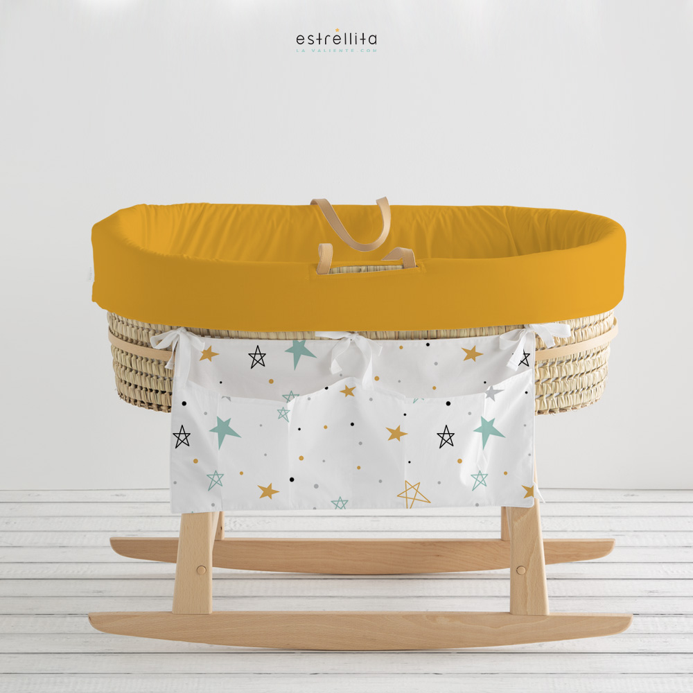 Esta vestidura para capazo mostaza incluye la tela que cubre el borde. Un tejido que está acolchado con guata de altísima calidad para que tu hijo quede completamente protegido. Este textil cuenta con espacio para las asas, de manera que no entorpezca su manejo.