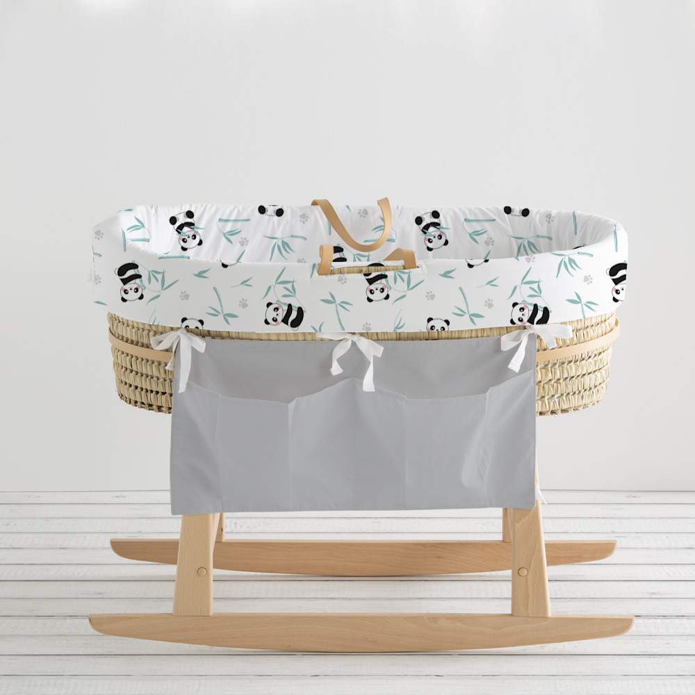 El diseño de esta vestidura para capazo Panda pertenece a la colección Panda, con dibujos de un oso panda comiendo bambú y otro cogiendo bambú, con ramas de bambú y huellas de oso panda. Con colores negro, gris y mint. Tejidos 100% algodón orgánico.